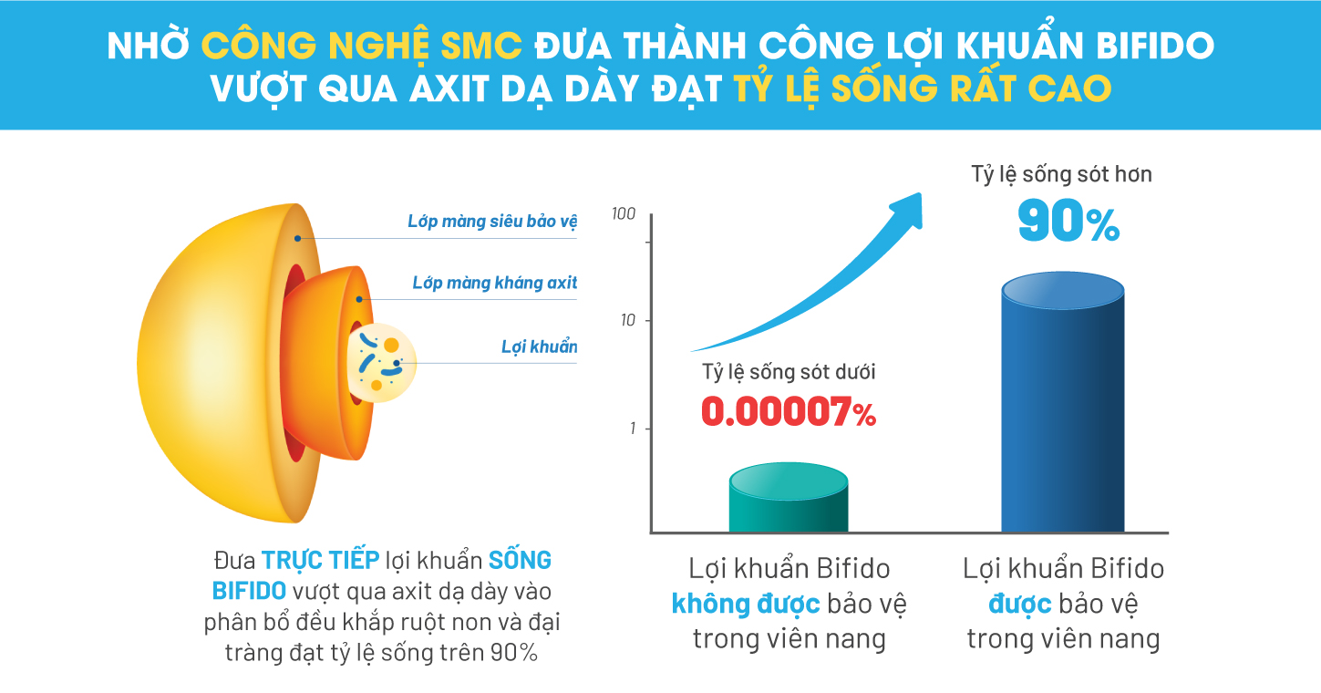 Tuy nhiên lợi khuẩn Bifido rất dễ bị phân hủy bởi axit dạ dày nên nếu không có công nghệ SMC Nhật thì sẽ không thể đưa được lợi khuẩn Bifido tới sâu đại tràng và phát huy tác dụng được. Hiện nay, không phải men vi sinh nào cũng có công nghệ kháng được axit dạ dày, nên không thể đưa được lợi khuẩn sống Bifido tới sâu đại tràng dẫn tới không có hiệu quả.